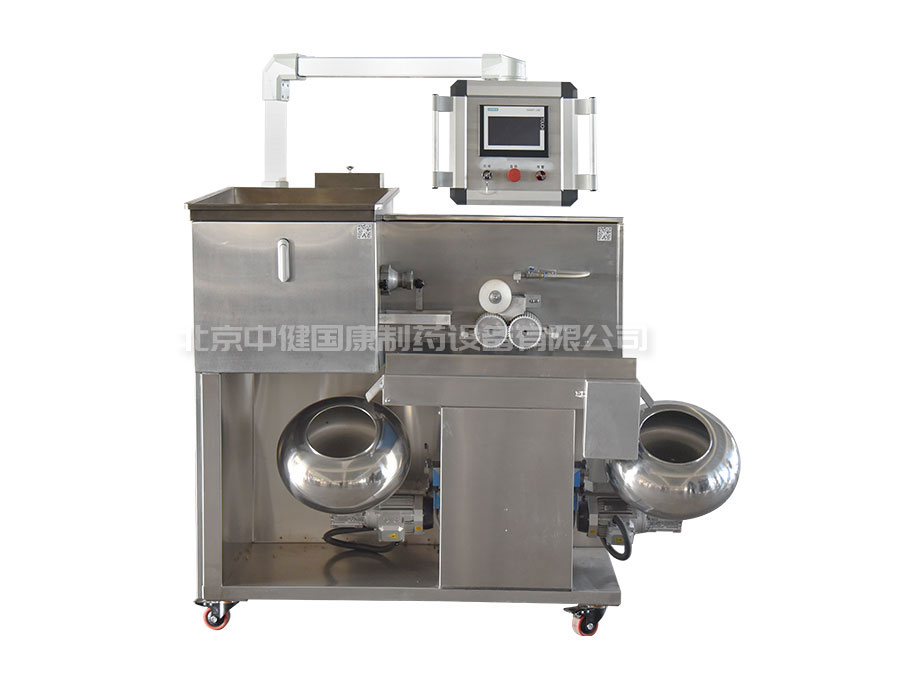 將混合好的物料放入料盤中,然后投入粉碎倉內(nèi),在推料螺旋的擠壓下物料從安裝在錐斗下部的模板孔中被擠出形成兩根等徑圓柱條,兩根圓柱條在自控導輪的控制下經(jīng)自控輪、條架、引導輪和導向架同步進入制丸刀槽,制丸刀同時作圓周運動和直線運動,將圓柱條均勻切節(jié)并搓成大小相等的球形丸丸劑可直接通過倒流板進入包衣鍋內(nèi)進行拋光狀光,自動化程度的高方便快捷。
