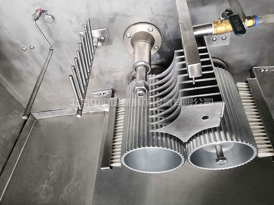 6、用酒精點(diǎn)滴藥條,制丸刀外側(cè)裝有毛刷,酒精裝在出條機(jī)構(gòu)的方箱內(nèi),通過球閥調(diào)節(jié)酒精量的大小。
