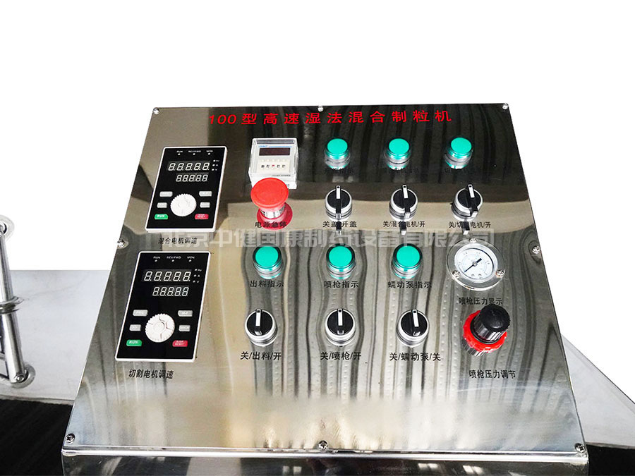 濕法混合制粒機(jī)主要由機(jī)體、鍋體、攪拌裝置、制粒刀、出料裝置、開蓋裝置、控制系統(tǒng)及充氣密封等輔助系統(tǒng)所組成,保障制粒全過程在良好的環(huán)境中完成。控制面板可采用普通按鍵或觸摸屏控制系統(tǒng),使操作更為方便直觀。